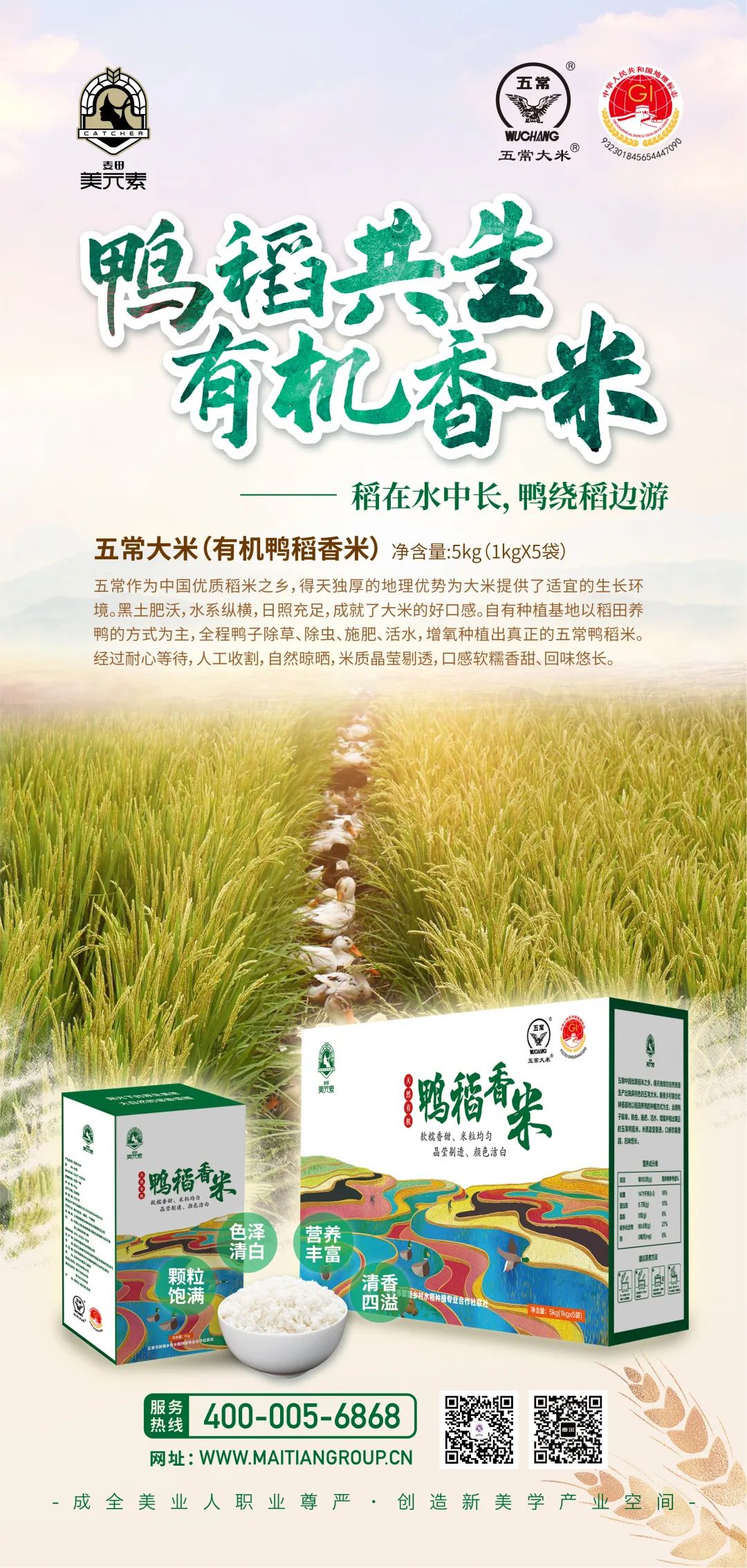 自有种植基地以稻田养鸭的方式为主,全程鸭子除草、除虫、施肥、活水,增氧种植出真正的五常鸭稻米。经过耐心等待,人工收割,自然晾晒,米质晶莹剔透,口感软糯香甜、回味悠长。